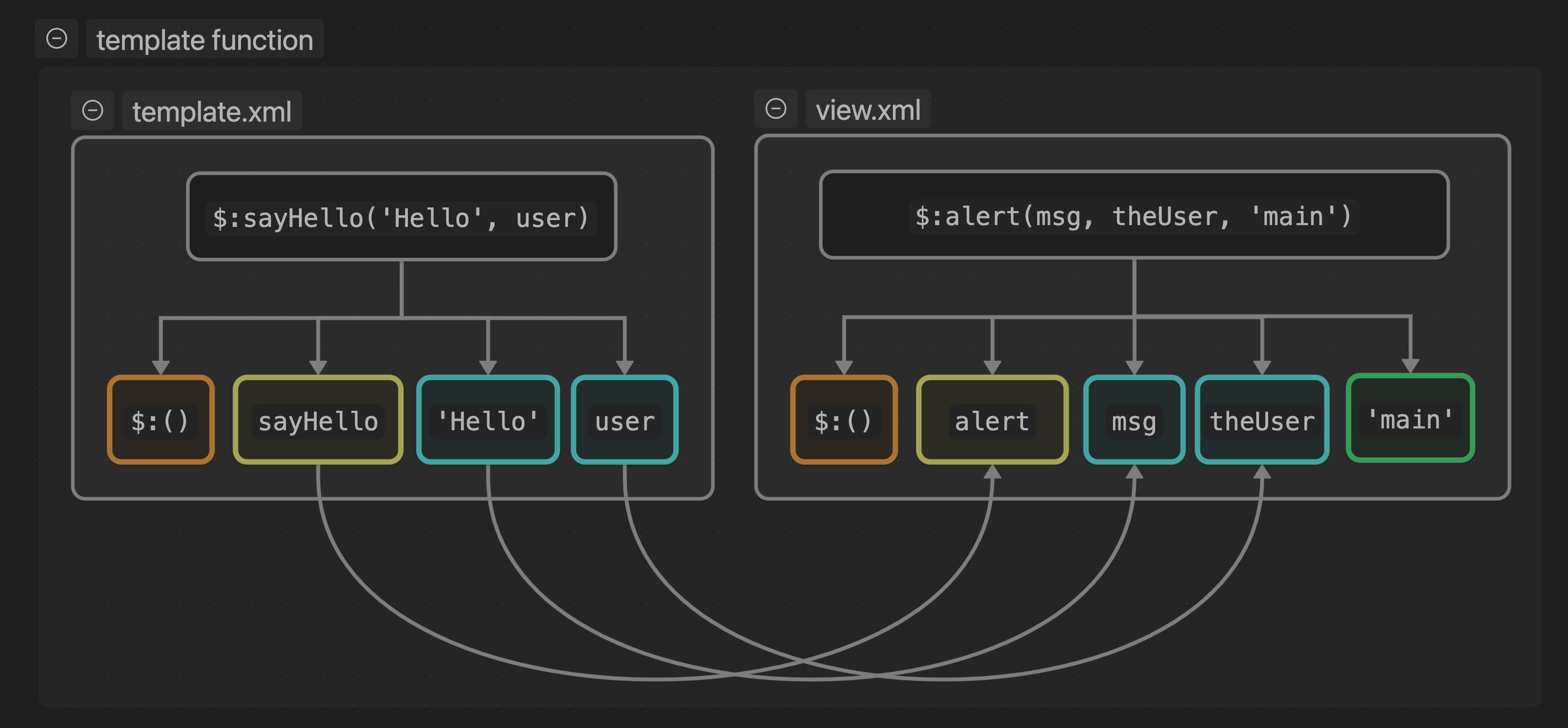 Also note that one could still pass view specific arguments, for example `<template name="``example" sayHello="$:alert(msg, theUser, 'main')"/>` and only the two matching `arg` values will be replaced, resulting in `on-press="$:alert('Hello', user, 'main')"`
